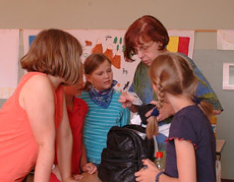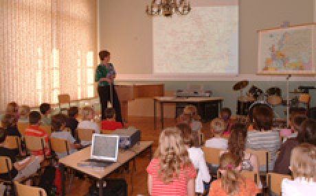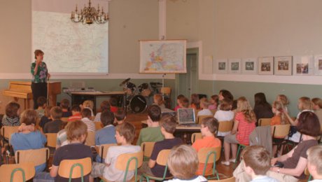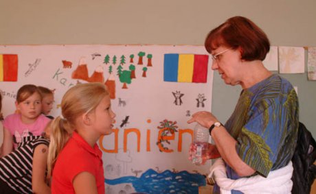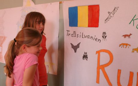 Im Rahmen der Projektwoche bot das Deutsche Kulturforum östliches Europa den Schülern der Klassen 4 bis 6 Einblicke in die wechselvolle Geschichte und stellte die verschiedenen Bewohner des neuen EU-Mitgliedstaates Rumänien vor. Gabriele Samietz, Referentin für Südosteuropa/Rumänien entwarf und organisierte das Programm, das an zwei Projekttagen von kompetenten Referenten dargeboten wurde. Die Referenten stammen aus Rumänien und haben dort ihre Kindheit und Jugend verbracht: Gudrun Spaan und Astrid Bartel aus Siebenbürgen/Transsilvanien und Dr. Josef Sallanz aus dem Banat.