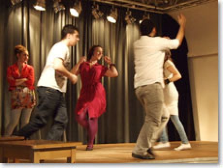 Hervorragend, wir haben uns wunderbar ergänzt. Über die Grundthemen für die Choreographie hatten wir uns schon vorher Gedanken gemacht, denn sie sollten die größeren, im Hintergrund der erzählenden Szenen aufscheinenden Themen reflektieren. So sollte der spielerische Charakter aus dem Titel der Werkstatt „Heimspiel in zwei Welten“ aufgegriffen werden, das Thema Identität – was passt zu mir, wo und wie fühle ich mich wohl – musste vorkommen, und das ewige Hin und Her zwischen den Möglichkeiten sollte durch das Wandermotiv aufgegriffen werden, etwas ironisch bezogen auch auf die Ungarndeutschen, indem wir diese Körperarbeit mit der Schubertschen Vertonung von Goethes Gedicht „An den Mond“ hinterlegten. Die letzte, an türkische Volkstänze angelehnte Choreographie sollte schließlich zum ungarndeutschen Volkstanz überleiten.