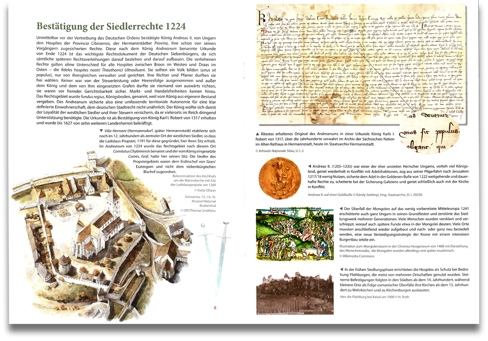TABVLARIVM Nationis Saxonicae ac Civitatis Sedisque C[ibiniensis] – Archiv der Sächsischen Nation und der Stadt und des Stuhls Hermannstadt. Inschrift über dem Eingang zum historischen Aufbewahrungsort der Urkunden der Sächsischen Nation im alten Rathaus von Hermannstadt, heute Historisches Museum Hermannstadt – Altemberger-Haus. Foto: DRI/Thomas Șindilariu. Im Türausschnitt Textbeginn der Bestätigungsurkunde des Andreanums durch König Karl I. Robert aus dem Jahr 1317, Staatsarchiv Hermannstadt, U. I. 3.Als König Andreas II. von Ungarn 1224 die Rechte der deutschen Siedler des südlichen Siebenbürgen in einer später »Andreanum« genannten Urkunde bestätigte, war die darin definierte weitreichende Autonomie für jene Zeit nichts Einzigartiges. Sie wurde es erst durch ihre konsequente Wahrung und ihren Ausbau im Laufe derJahrhunderte durch jene Gruppe, für die sich später der Begriff »Siebenbürger Sachsen« etablierte. Auf der Basis dieses bis ins 17. Jahrhundert durch die Landesherren vielfach bestätigten Dokuments wurden die inzwischen lutherischen Deutschen Siebenbürgens im 16. Jahrhundert zum staatstragenden Landstand eines weitgehend selbstständigen Fürstentums, das sich unter anderem durch eine europaweit einzigartige Konfessionsfreiheit auszeichnete.
